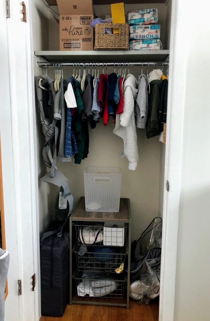 The closet is not cute and doesn’t even have a door on it because I took it off to paint it when we bought the house and then forgot about it (oops). But it gets the job done with his little sweaters and rompers hung on hangers because it’s adorable, and diapers, wipes, and breastfeeding/pumping stuff that I’m not currently using above. In the drawers below are towels, extra sheets, and baby wearing wraps. On the left is the Baby Bjorn travel crib which is so easy to travel with and worth the price, in my opinion.