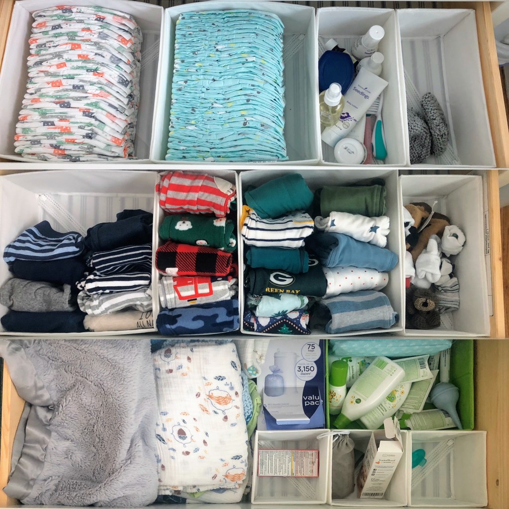 Drawer 1: diapers (daytime and overnight) and baby care; Drawer 2: clothes; Drawer 3: blankets, extra toiletries, thermometer, random baby things