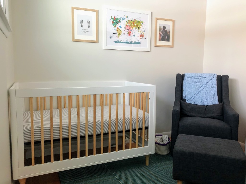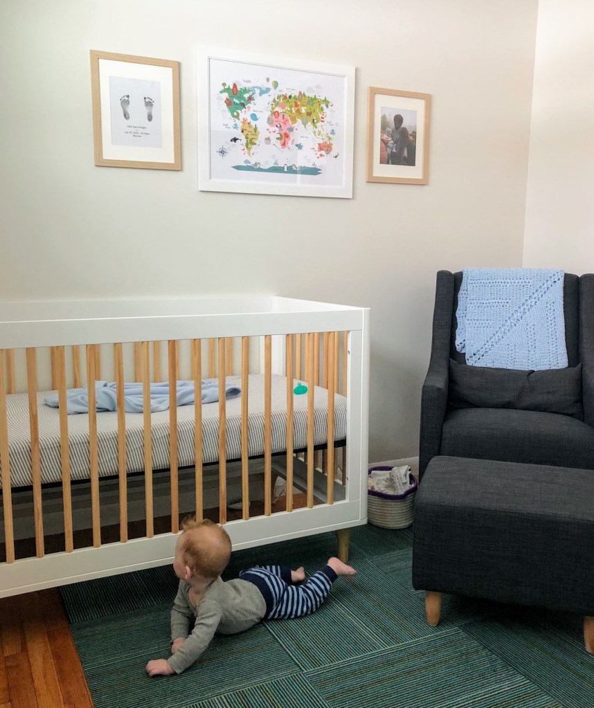 When we were preparing for Baby, I knew that I wanted him to sleep in our room for the first few months and that decorating a baby’s room is much more for the parents than for the baby. My priorities were a crib, a glider, and a dresser without a built-in changing station so it could be reused later. And folks, that’s about all I did!