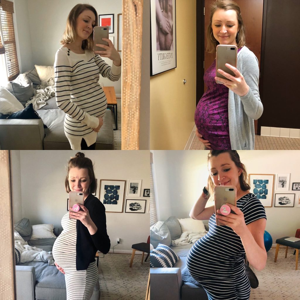 I wore the same outfits over and over and over again. I got bored, I was probably a little stinky, but it was not worth spending a ton of money on a ton of new outfits that I wasn’t going to wear for that long. If I were to do it again, I’d focus on a few things that were higher quality and maybe a little more expensive. Some of the cheaper options just didn’t hold up to constant washing and wearing (like the Motherhood Maternity brand). Below is a little more detail on the what and why of what I wore.