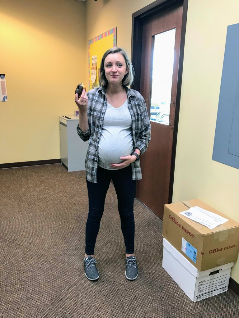 In the winter, I wore a lot of dresses over leggings. Most of my dresses were from Target and Gap. Target also had the best tank tops that were excellent for layering (linked above). Another go-to outfit was a maternity T-shirt from Gap with a flannel over it. Unbuttoned, of course, as seen here in a picture that a coworker so kindly took on donut day.
